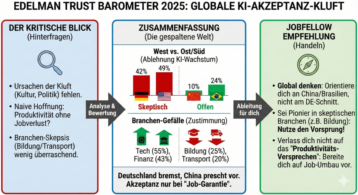2. Sei Pionier in skeptischen Branchen: Arbeitest du in Bildung oder Transport? Die Skepsis dort ist riesig (nur 20-25% Zustimmung). Das ist deine Chance! Wer hier KI sinnvoll integriert, hat einen enormen Vorsprung vor der abwartenden Masse.